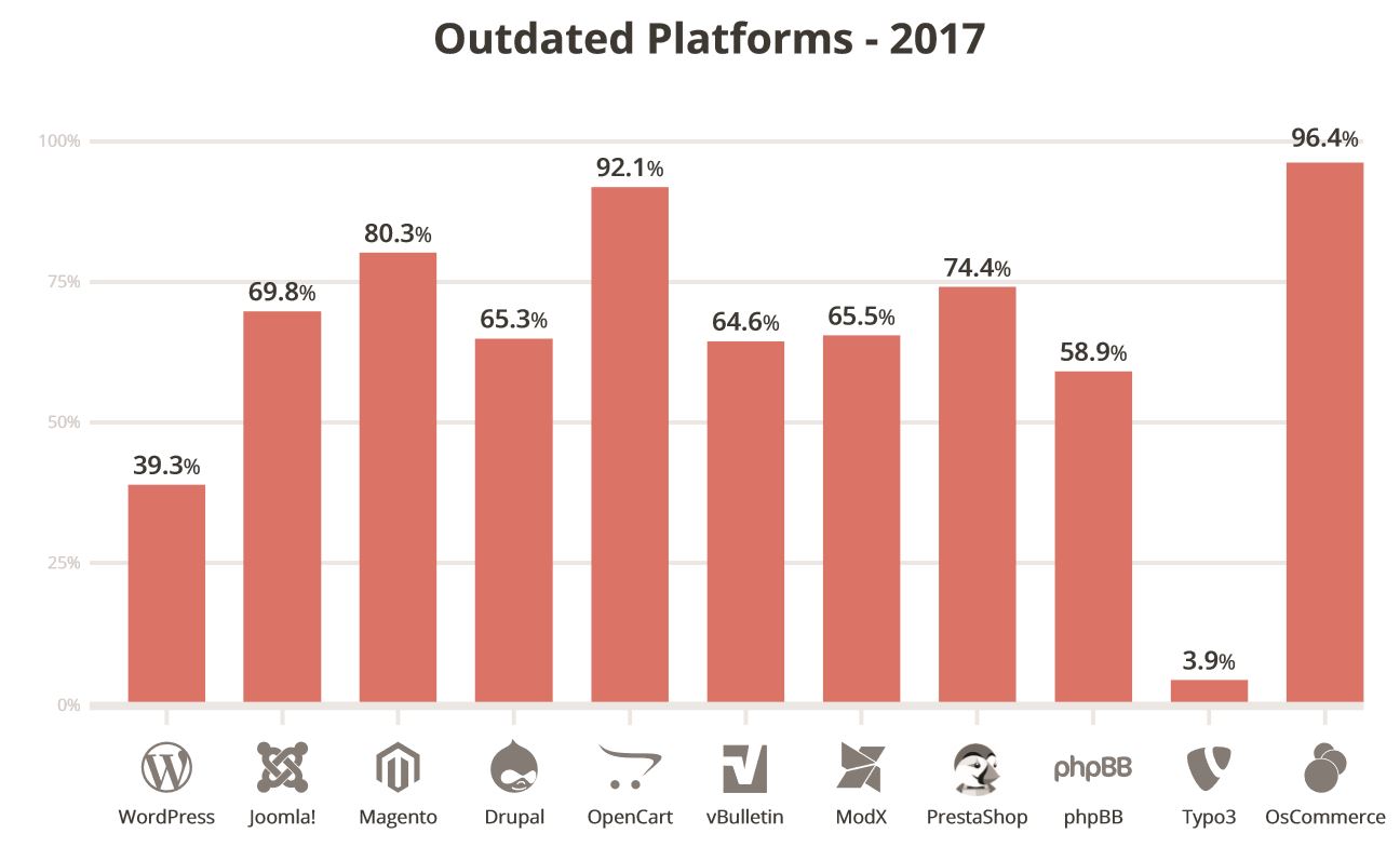 - E-commerce Platforms - What's concerning is to see the current state of e-commerce open-source CMS applications. Take a look at OpenCart (92%), PrestaShop (74%), OsCommerce (96%) and Magento (80.3%). These are the core applications users are leveraging to perform online commerce transactions. In many ways this speaks directly to the complexities associated with these platforms to upgrade, which when coupled with human behavior, is a recipe for disaster. Unfortunately, you could argue, they more than others, should have easier mechanisms to facilitate maintenance (they are managing sensitive data - credits cards).