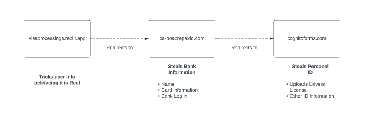 Here is the anatomy of the scam and how it navigates between different systems to complete the cycle and capture as much information from the user as possible: