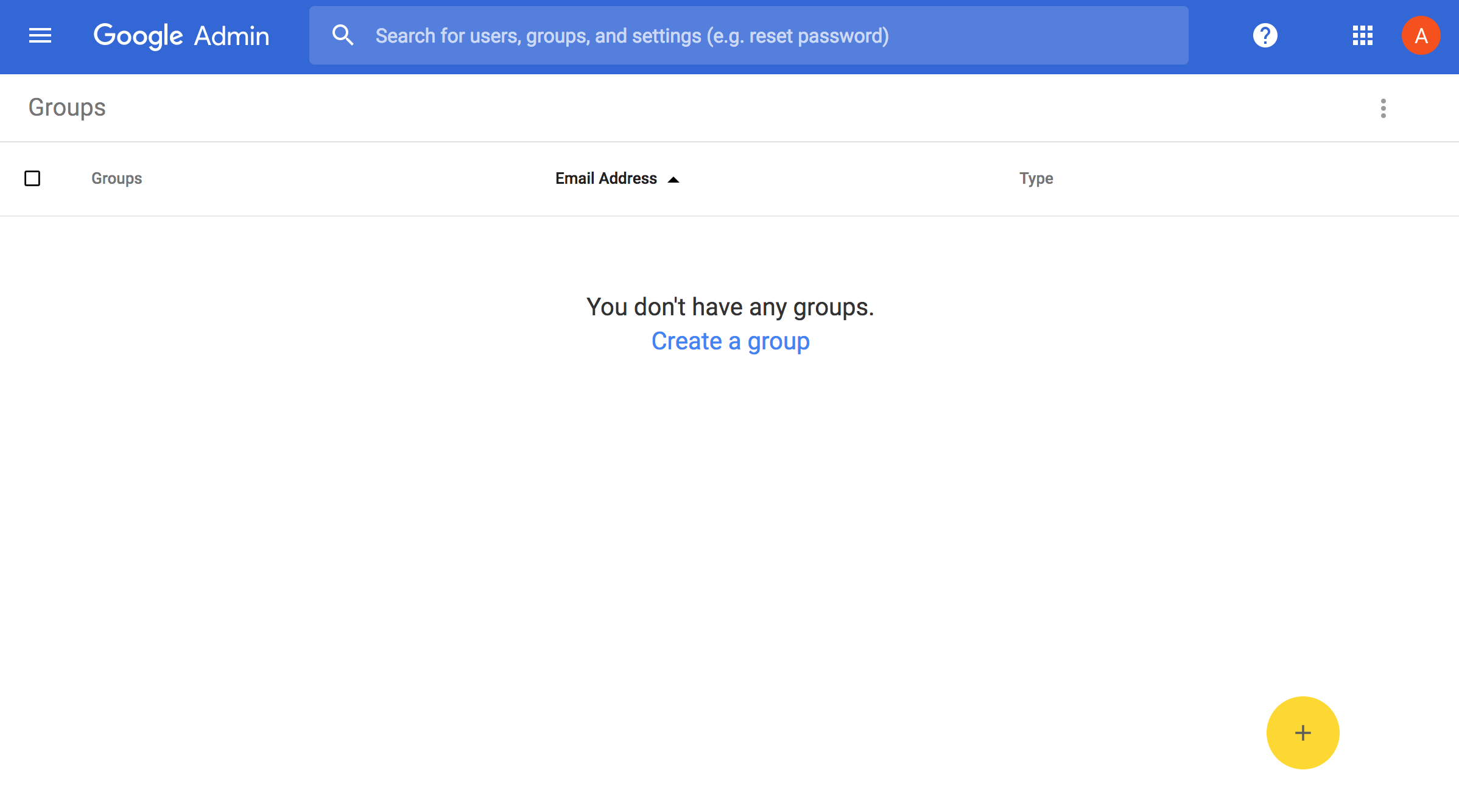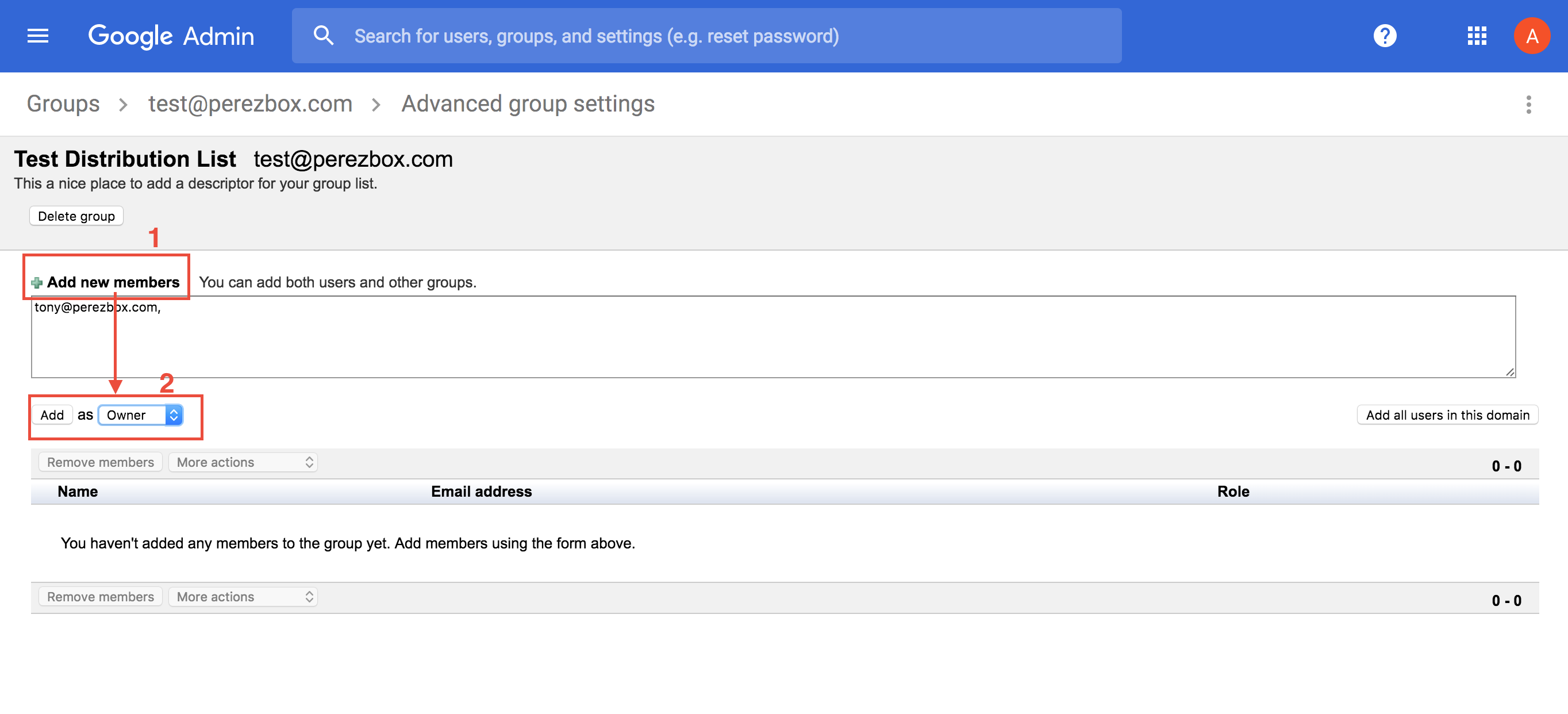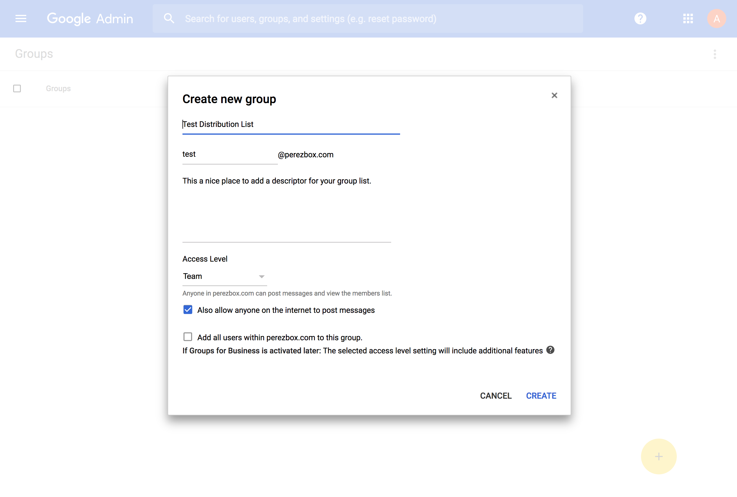 Click on the Groups app:   This is the create a new group panel:   Define the name of the group, and an email to use (e.g., info@domain.com, sales@domain.com, etc.. ). Give it a description. Allow anyone on the Internet to post to the group. This will be important so that if someone sends an email to info@domain.com it doesn't get declined.   After creating the distribution list (i.e., be sure to click "create"), you will be in the list settings page. Click on Manage users in Test Distribution List. This will allow you to add users to the list, you'll need to do this if you wish to receive emails when someone sends in an email. Every user on the distribution list will get an email. Click on Add New Members. The email should auto-populate if it's in the domain. Then click on Add as "Owner" or "Member". This is an important step if you want the emails to reach your inbox. You also have the option to add all the users under the domain.