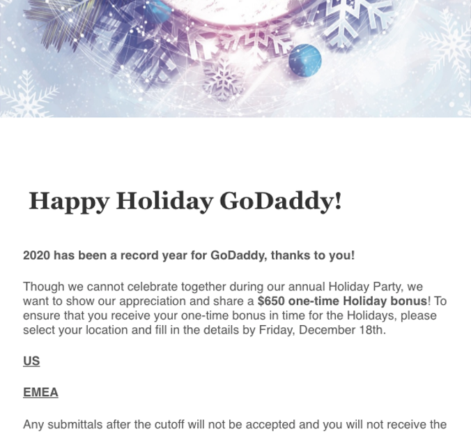 For context, during Christmas, 2020, GoDaddy decided to run a test in which they offered a bonus in lieu of a holiday party. Here is what it read: