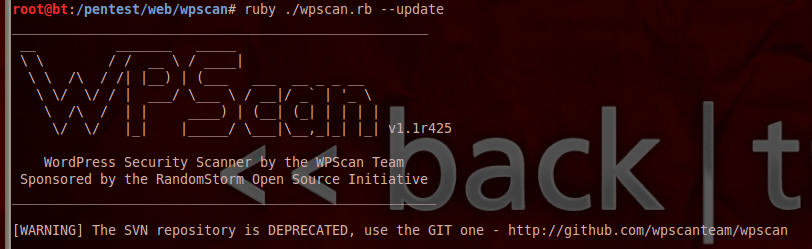 So I have been playing with a number of tools lately and this was perhaps one of the easiest things I couldn't figure out. Talk about having a "WTF" moment. If you're curious, wpscan is a vulnerability scanner designed to pentest WordPress applications. It has a number of features that allow you to enumerate usernames, plugins, and TimThumb files. I'll actually be demonstrating the tool this weekend at WordCamp Las Vegas.   As for BackTrack its a Linux distribution also designed for pentesters. If you're interested more in malware reverse engineering then you might want to look at the REMnux linux distribution. In any event, that's a subject for another day... WPSCAN came pre-configured with BackTrack but as you might expect, it was out of date. So naturally I tried their update option: