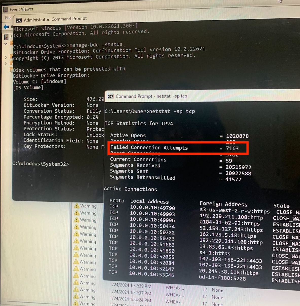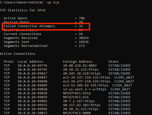 The icing on the cake to make the case is to show all those bad connection attempts by hackers trying to get into the machine. They did this by running "netstat -sp tcp" in the command prompt which generated this: